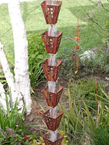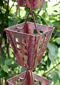 A new, exclusive addition to our aged square cups designs. This longer cup adds a distinctive Arts & Crafts flower motif (six-square cutout with a center "stem"). Made of pure copper, with a folded lip along the top for stiffness, each cup is welded together by hand.