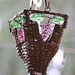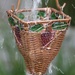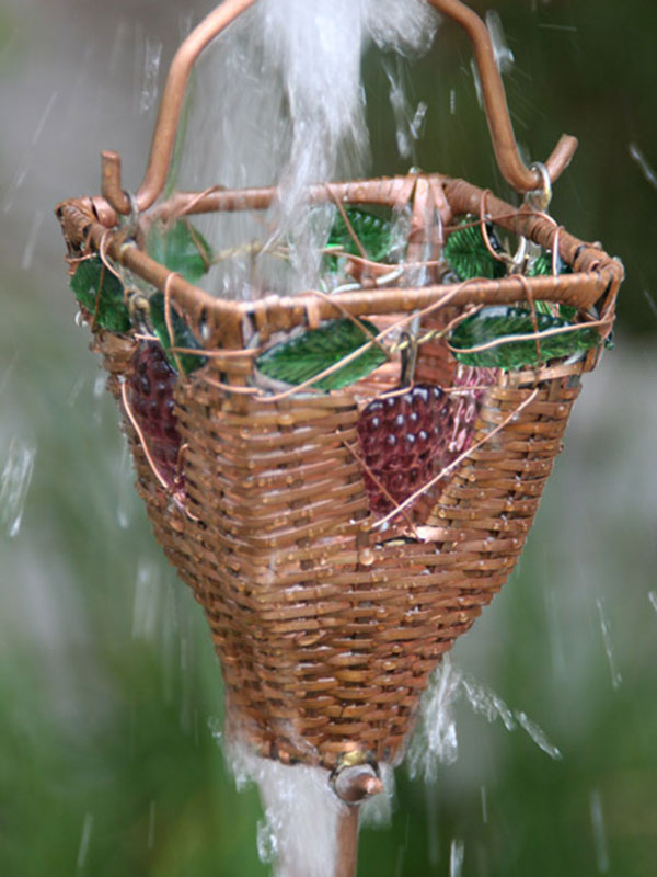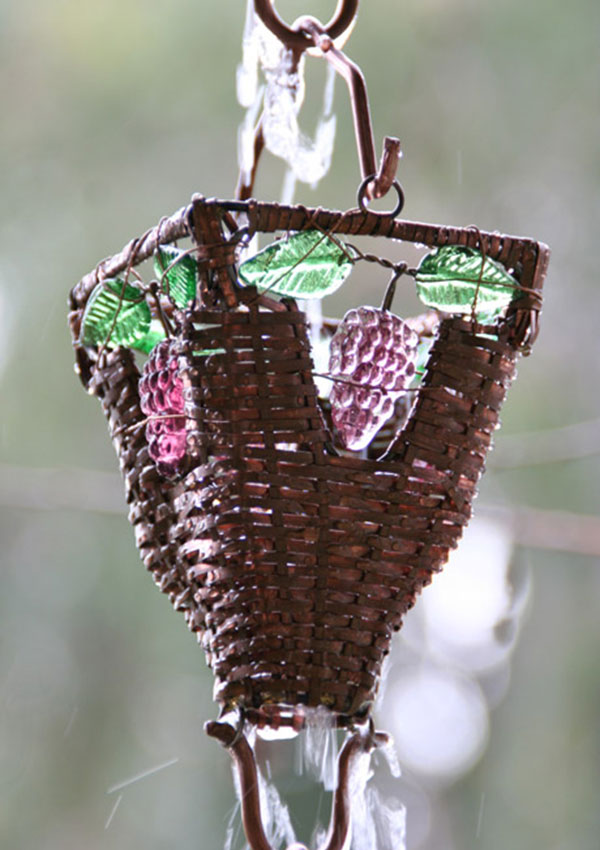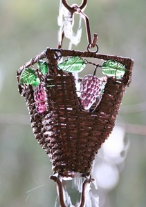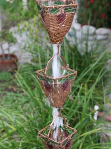 A basket made of pure copper, with a real glass grape and leaf motif! The "frame" is stainless steel wire. The basket is woven with flat copper strips, tightly enough that water passes through the cup (as it should) and not out the sides.