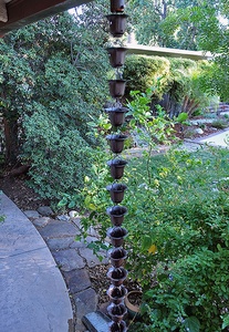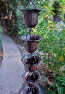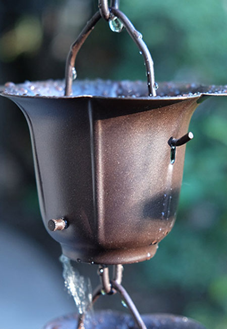 Here is our classic flared design in a hand finished iron cup, powder coated a perfect bronze color. Iron is very stiff and far less expensive than copper. With the powder coated finish, it will be quite durable. Comes with a gutter attachment piece.