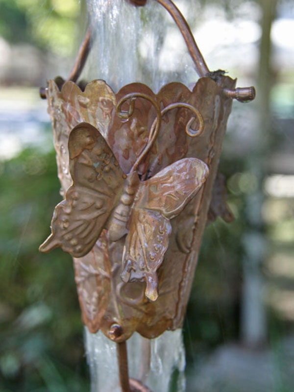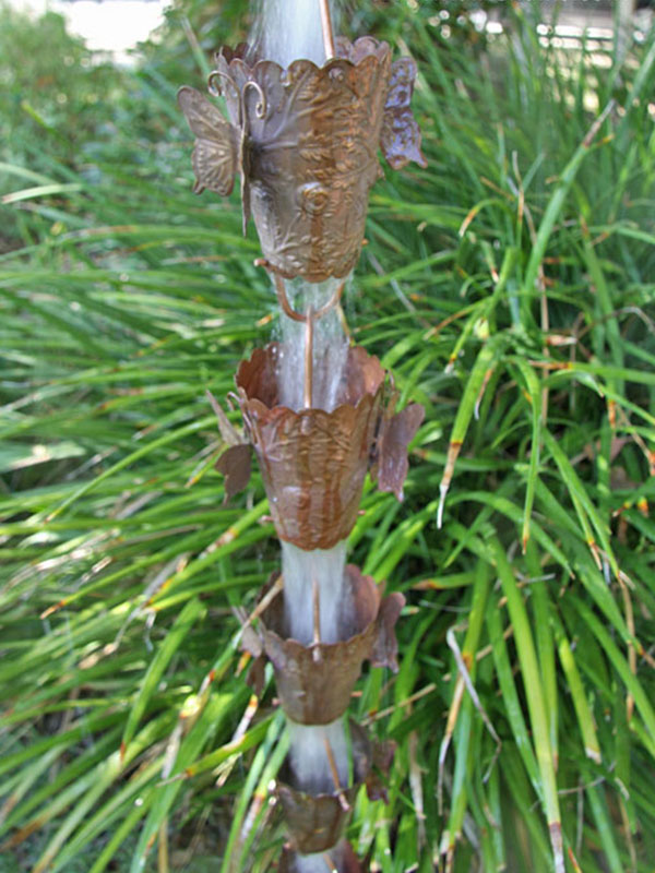 Hand-tooled butterflies, complete with antennae, wander the outside of this beautifully detailed cup chain, in pure unfinished copper. With a large open bottom, this chain has excellent performance characteristics.