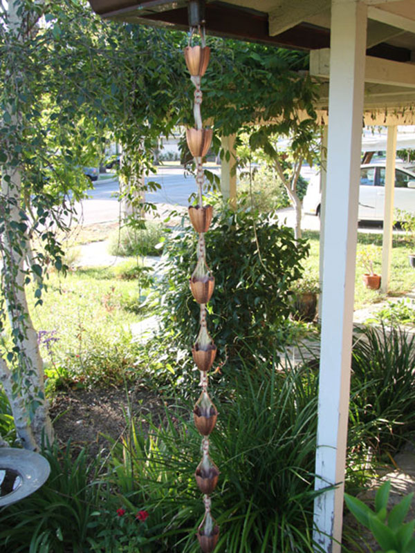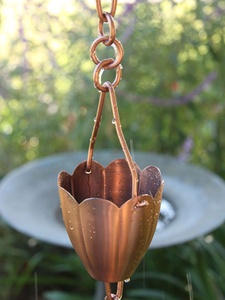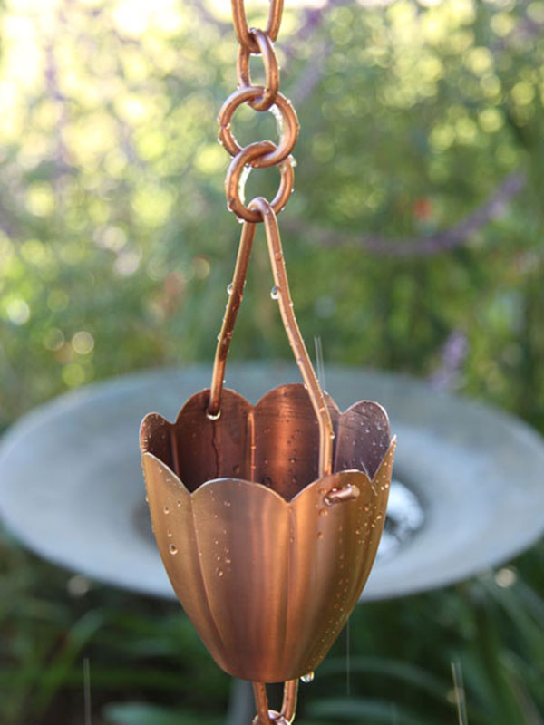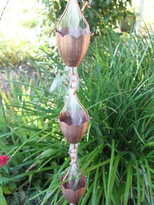 Three small circles support a larger fluted cup, combining the beauty of both link and cup style rain chains.