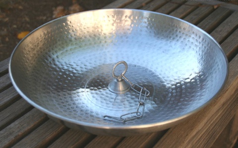 This Aluminum Dish is great for the bottom of our rain chain. You can also use it indoors as a container, fruit display, or whatever else you can think of. Just like our hammered Copper Dish, but made of pure aluminum.