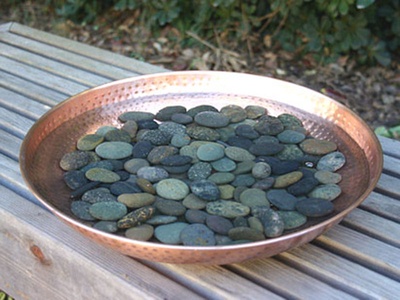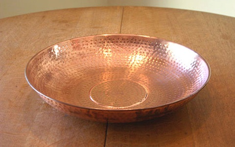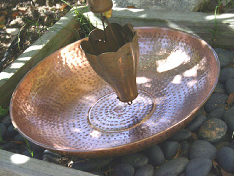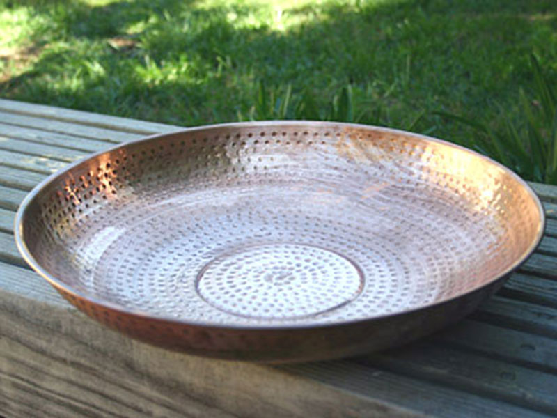 A utility basin for many purposes! Shown here as a catch basin for our Scallop Cup rain chain, but it can be a table bowl or even a birdbath! Made of pure, unfinished copper, it will age beautifully, indoors or out! 16" in diameter, 3" high. Color and surface texture may vary, as each one is made by hand.
