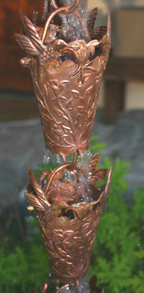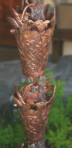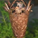 Pure copper cups featuring hand tooled flowers and foliage in the sides. Two pairs of hummingbirds hover around the rim, sipping nectar from a flower. To prevent damage in transit and reduce packaging volume, the upper wires are shipped separately from the cups, so some assembly is required -- it takes just a few minutes with no tools.