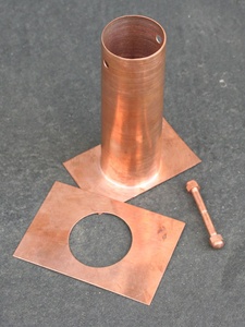 A longer version of our popular #RCR-1 Installation Kit. This reducer drops into the gutter hole (An additional sleeve is provided "just in case" for larger gutter openings). Your rain chain hangs from the bolt at the bottom. The water is directed downward onto the rain chain for best possible water flow efficiency! Made of pure, thick copper that will age beautifully.