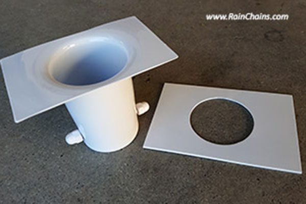 A version of our standard Installation Kit, produced in Aluminum then powdercoated white. This is the perfect accessory to make your rain chain installation easy and work perfectly! This reducer drops into the gutter hole (An additional sleeve is provided "just in case" for larger gutter openings). Your rain chain hangs from the bolt at the bottom. The water is directed downward onto the rain chain for maximum water flow efficiency!
