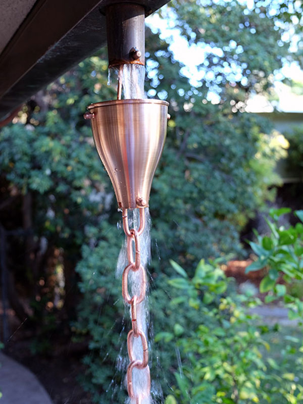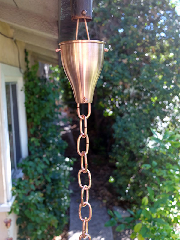 Our new Link Chain Reducer in pure copper is a specially designed, large rain chain cup with a D-clip across the bottom.