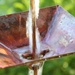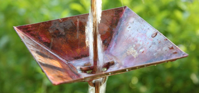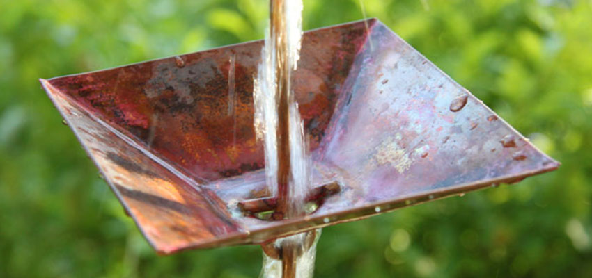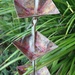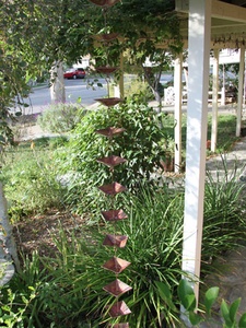 The Pagoda Cups are pure copper, "pre-aged" and have reddish streaking, along with dark brown, black and even white. It's a beautiful aging effect, that will darken and patina over time. Not a patina coating, the torch itself causes this same pre-aged effect as on our Star Flower chains and other Square Cup models. As a handmade product, there is variability in coloration with each chain, and even within each section of a chain.