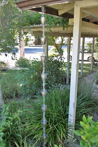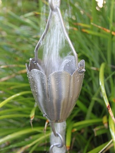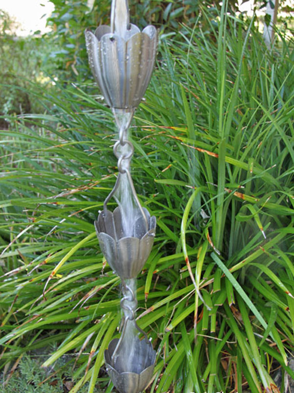 Three small circles support a larger fluted cup, combining the beauty of both link and cup style rain chains.
