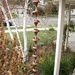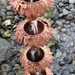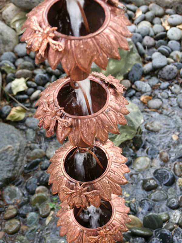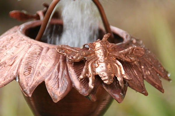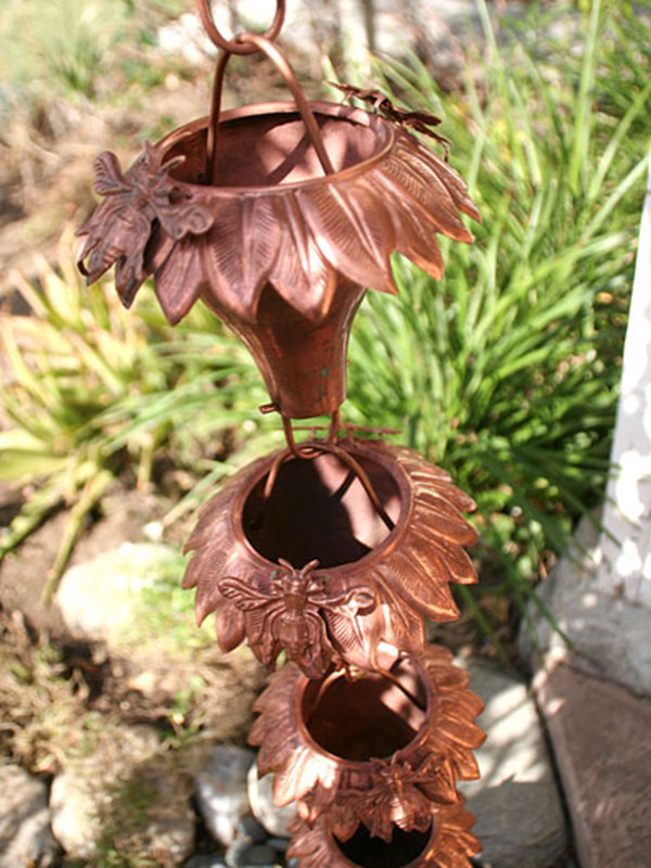 Two honeybees perch on the top, looking for nectar, which is the rainfall, of course! Made of unfinished copper, this rain chain will age beautifully over time.