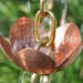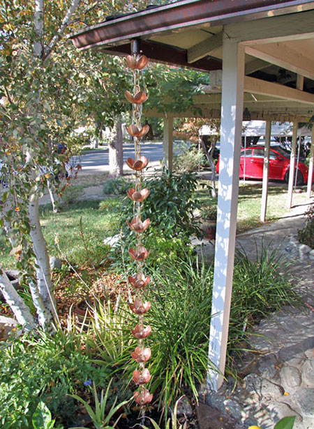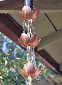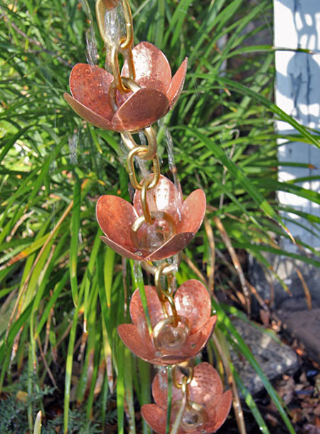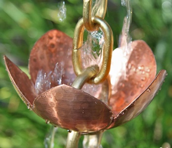 This spectacular chain features a very large, hand hammered cup! The pure copper cup (with petal details) is suspended between thick, pure brass rings. This is a gorgeous sculptural piece for your home, and functional too. With a large central hole flanked by three smaller drain holes, this chain will handle diverse rainfall conditions.