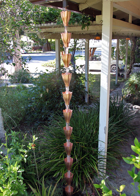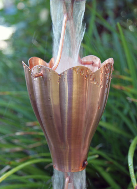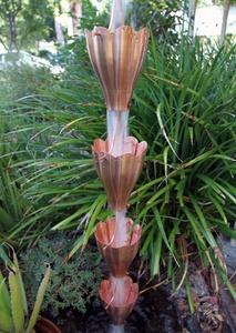 One of the largest cup style rain chains - each cup is well over 4 inches across by 5 1/2 inches in length! This rainchain will handle heavy waterflow conditions. The pure, thick unfinished copper will age to a beautiful patina over time. An artistic downspout for your home!